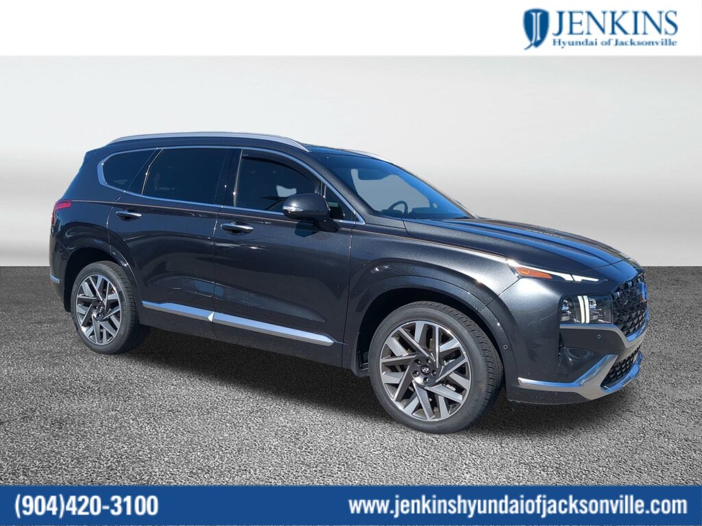 CARFAX One-Owner. Clean CARFAX. This 2023 Hyundai Santa Fe Calligraphy in Portofino Gray features Option Group 01, 12 Speakers, 4-Wheel Disc Brakes, ABS brakes, Air Conditioning, Alloy wheels, AM/FM radio: SiriusXM, Apple CarPlay & Android Auto, Auto High-beam Headlights, Auto-dimming Rear-View mirror, Automatic temperature control, Axle Ratio: 3.316, Brake assist, Bumper Applique, Bumpers: body-color, Cargo Cover/Screen, Cargo Net, Cargo Tray, Carpeted Floor Mats, Delay-off headlights, Driver door bin, Driver vanity mirror, Dual front impact airbags, Dual front side impact airbags, Electronic Stability Control, Emergency communication system, Exterior Parking Camera Rear, Four wheel independent suspension, Front anti-roll bar, Front Bucket Seats, Front Center Armrest, Front dual zone A/C, Front reading lights, Fully automatic headlights, Garage door transmitter: HomeLink, harman/kardon® Speakers, Heads-Up Display, Heated & Ventilated Front Bucket Seats, Heated door mirrors, Heated front seats, Heated rear seats, Heated steering wheel, Illuminated entry, Leather steering wheel, Low tire pressure warning, Memory seat, Mudguards, Navigation System, Occupant sensing airbag, Outside temperature display, Overhead airbag, Overhead console, Panic alarm, Passenger door bin, Passenger vanity mirror, Power door mirrors, Power driver seat, Power Liftgate, Power moonroof, Power passenger seat, Power steering, Power windows, Quilted Premium Nappa Leather Seat Trim, Radio: AM/FM Harman Kardon Display Audio, Rain sensing wipers, Rear anti-roll bar, Rear seat center armrest, Rear window defroster, Rear window wiper, Remote keyless entry, Security system, Speed control, Speed-sensing steering, Split folding rear seat, Spoiler, Steering wheel mounted audio controls, Tachometer, Telescoping steering wheel, Tilt steering wheel, Traction control, Trip computer, Turn signal indicator mirrors, Variably intermittent wipers, Ventilated front seats, and Wheels: 20" x 8.0J Alloy . Visit our showroom 24/7 at Jenkinshyundaiofjacksonville or call 904-420-3100. FWD