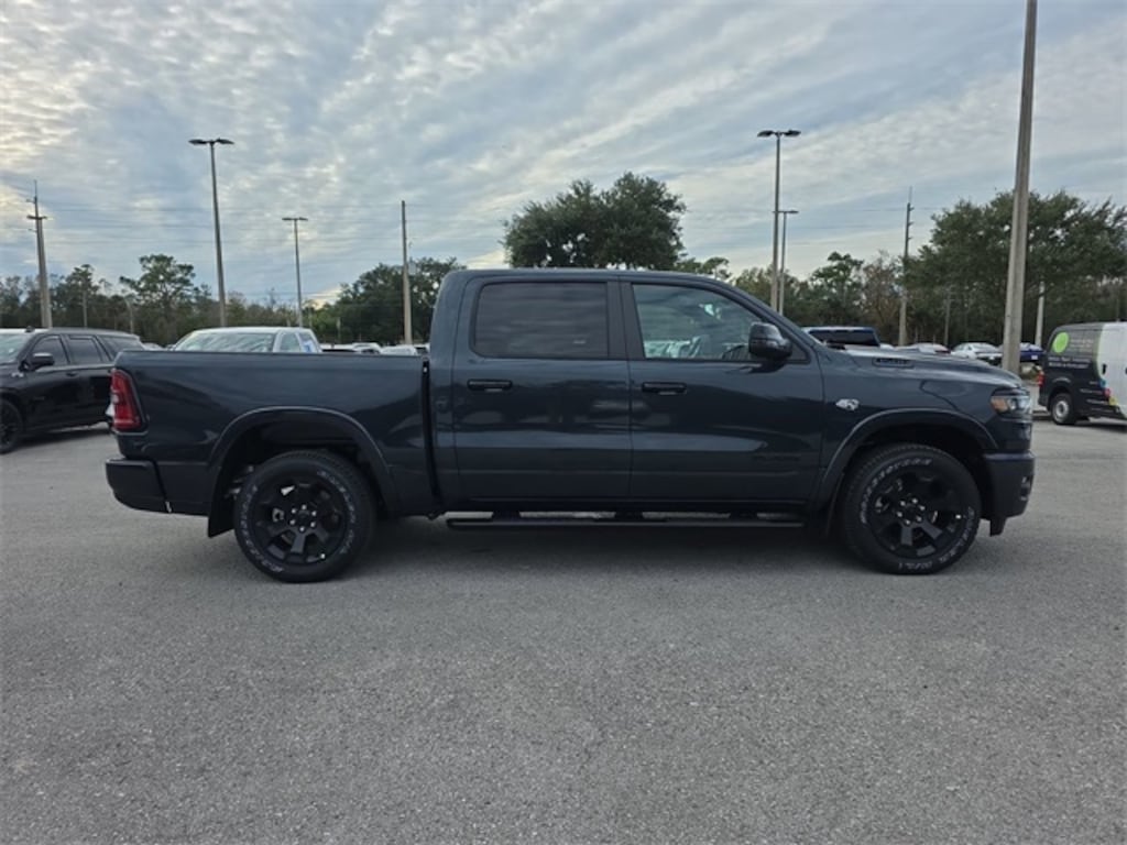 This vehicle comes equipped with Big Horn Level 1 Equipment Group (115V Auxiliary Power Outlet, 2nd Row in Floor Storage Bins, 3 Rear Seat Head Restraints, 4 Way Front Headrests, 400W Inverter, Auto Power-Folding Mirrors, Auto-Dimming Exterior Driver Mirror, Auto-Dimming Rear-View Mirror, Black Exterior Mirrors, Black Premium Power Mirrors, Body Color Fender Flares, Bucket Seats, Center Console Parts Module, Convex Wide-Angle Exterior Mirror Insert, Deluxe Cloth Bucket Seats, Exterior Mirrors Courtesy Lamps, Exterior Mirrors with Heating Element, Exterior Mirrors with Supplemental Signals, Front Seat Back Map Pockets, Full Length Floor Console, Glove Box Lamp, Heated Front Seats, Heated Steering Wheel, Leather Wrapped Steering Wheel, Manual Adjust 4-Way Front Passenger Seat, Power 2-Way Driver Lumbar Adjust, Power Adjust 8-Way Driver Seat, Power Adjustable Pedals, Rear 60/40 Folding Seat, Rear Center Armrest, Rear Dome with on/Off Switch Lamp, Rear Power Sliding Window, Rear Window Defroster, SiriusXM Radio Service, SiriusXM Satellite Radio, Steering Wheel Mounted Audio Controls, Sun Visors with Illuminated Vanity Mirrors, and Universal Garage Door Opener), Night Edition (Accent Color Door Handles, Accent Color Premium Power Mirrors, Accent Color Tailgate Handle, Anti-Spin Differential Rear Axle, Black Exterior Truck Badging, Black Headlamp Bezels, Black Interior Accents, Black Painted Exterior Mirrors Caps, Black Tail Lamp Bezels, Body Color Front Bumper, Body Color Rear Bumper with Step Pads, Dual Exhaust with Black Tips, Grille Black Surround Black Mesh, RAM Grille Badge - Black, and Wheels: 20" x 9.0" Aluminum Painted Clad), Quick Order Package 27Z Big Horn, 33 Gallon Fuel Tank, 4-Wheel Disc Brakes, 48V Belt Starter Generator, 4G LTE Wi-Fi Hot Spot, 6 Speakers, ABS brakes, Air Conditioning, Alloy wheels, AM/FM radio, Apple CarPlay, Apple CarPlay/Android Auto, Auto High-beam Headlights, Brake assist, Bumpers: chrome, Cloth Bucket Seats, Compass, Connectivity - US/Canada, Delay-off headlights, Driver door bin, Dual front impact airbags, Dual front side impact airbags, Electronic Stability Control, Front anti-roll bar, Front Bucket Seats, Front Center Armrest w/Storage, Front fog lights, Front reading lights, Front wheel independent suspension, Fully automatic headlights, Global Telematics Box Module, Google Android Auto, GPS Antenna Input, Heated door mirrors, Illuminated entry, Integrated Center Stack Radio, Integrated Voice Command with Bluetooth, Low tire pressure warning, Manual Adjust 4-Way Driver Seat, Manual Folding Exterior Mirrors, Occupant sensing airbag, Outside temperature display, Overhead airbag, Overhead console, Panic alarm, ParkView Rear Back-Up Camera, Passenger door bin, Passenger vanity mirror, Power door mirrors, Power steering, Power windows, Radio data system, Radio: Uconnect 5 W with 8.4" Display, RAM Grille Badge - Chrome, Rear anti-roll bar, Rear step bumper, Remote keyless entry, Speed control, Supplier Part Tracking (J-1), Tachometer, Telescoping steering wheel, Tilt steering wheel, Traction control, Trip computer, USB Host Flip, Variably intermittent wipers, and Voltmeter .